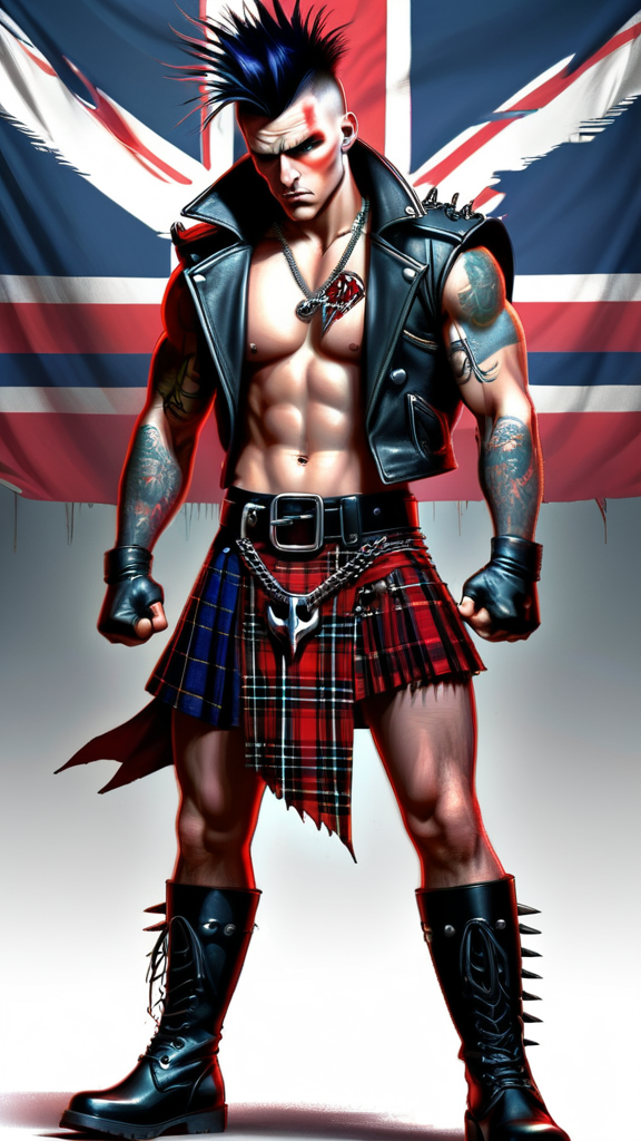 hypermasculine male super-hero. British Punk Rocker. Young man, college aged. Jet-black hair, shark fin Mohawk with shaved hair on the sides of head. Pale grey eyes, intense gaze, slight scowl on face. Handsome, strong brow and jaw. Soul Patch on face. Strong, muscular, sinewy, brute, broad chest and powerful legs. Extremely hairy hirsute body, especially on chest, torso, armpits and legs. Scorpion tattoo on chest. O-ring chain harness on chest. Black leather bracers/armbands with spikes. Dark red short cape, tattered and torn. Full kilt, red and black tartan pattern, no underwear underneath. Black leather studded belt. Kilt is worn and tattered, exposing hairy legs underneath. Black leather combat boots. Full body pose, fighting stance. British flag in background.