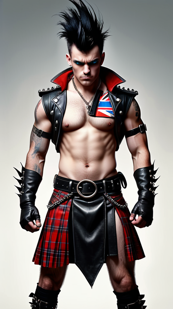 hypermasculine male super-hero. British Punk Rocker. Young man, college aged. Jet-black hair, shark fin Mohawk with shaved hair on the sides of head. Pale grey eyes, intense gaze, slight scowl on face. Handsome, strong brow and jaw. Soul Patch on face. Strong, muscular, sinewy, brute, broad chest and powerful legs. Extremely hairy hirsute body, especially on chest, torso, armpits and legs. Scorpion tattoo on chest. O-ring chain harness on chest. Black leather bracers/armbands with spikes. Dark red short cape, tattered and torn. Full kilt, red and black tartan pattern, no underwear underneath. Black leather studded belt. Kilt is worn and tattered, exposing hairy legs underneath. Black leather combat boots. Full body pose, fighting stance. British flag in background.
