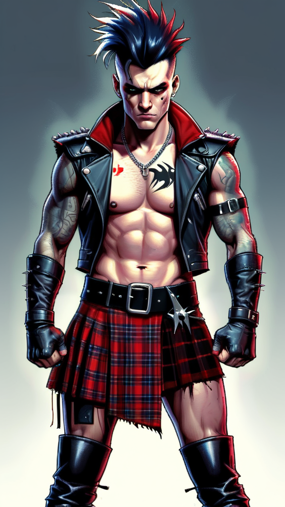 hypermasculine male super-hero. British Punk Rocker. Young man, college aged. Jet-black hair, shark fin Mohawk with shaved hair on the sides of head. Pale grey eyes, intense gaze, slight scowl on face. Handsome, strong brow and jaw. Soul Patch on face. Strong, muscular, sinewy, brute, broad chest and powerful legs. Extremely hairy hirsute body, especially on chest, torso, armpits and legs. Scorpion tattoo on chest. O-ring chain harness on chest. Black leather bracers/armbands with spikes. Dark red short cape, tattered and torn. Full kilt, red and black tartan pattern, no underwear underneath. Black leather studded belt. Kilt is worn and tattered, exposing hairy legs underneath. Black leather combat boots. Full body pose, fighting stance. British flag in background.