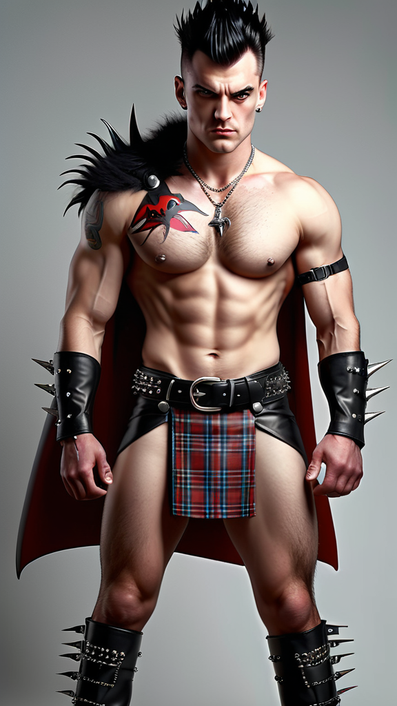 hypermasculine male super-hero. British Punk Rocker. Young man, college aged. Jet-black hair, shark fin Mohawk with shaved hair on the sides of head. Pale grey eyes, intense gaze, slight scowl on face. Handsome, strong brow and jaw. Soul Patch on face. Strong, muscular, sinewy, brute, broad chest and powerful legs. Extremely hairy hirsute body, especially on chest, torso, armpits and legs. Scorpion tattoo on chest. O-ring chain harness on chest. Black leather bracers/armbands with spikes. Dark red short cape, tattered and torn. Full kilt, red and black tartan pattern, no underwear underneath. Black leather studded belt. Kilt is worn and tattered, exposing hairy legs underneath. Black leather combat boots. Full body pose, fighting stance. British flag in background.