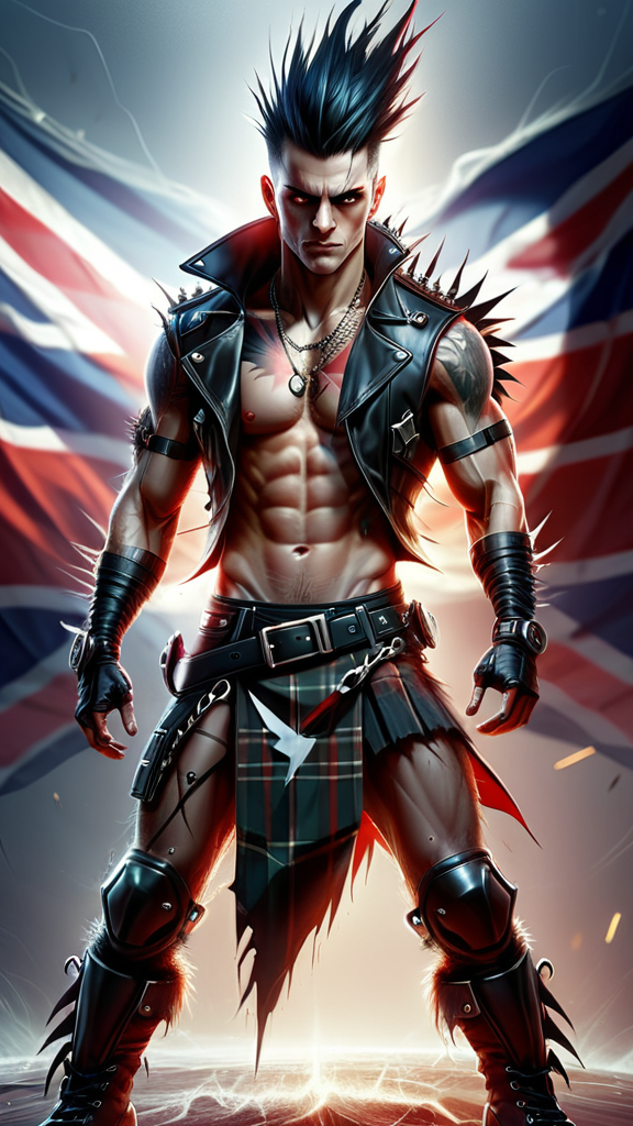 hypermasculine male super-hero. British Punk Rocker. Young man, college aged. Jet-black hair, shark fin Mohawk with shaved hair on the sides of head. Pale grey eyes, intense gaze, slight scowl on face. Handsome, strong brow and jaw. Soul Patch on face. Strong, muscular, sinewy, brute, broad chest and powerful legs. Extremely hairy hirsute body, especially on chest, torso, armpits and legs. Scorpion tattoo on chest. O-ring chain harness on chest. Black leather bracers/armbands with spikes. Dark red short cape, tattered and torn. Full kilt, red and black tartan pattern, no underwear underneath. Black leather studded belt. Kilt is worn and tattered, exposing hairy legs underneath. Black leather combat boots. Full body pose, fighting stance. British flag in background.