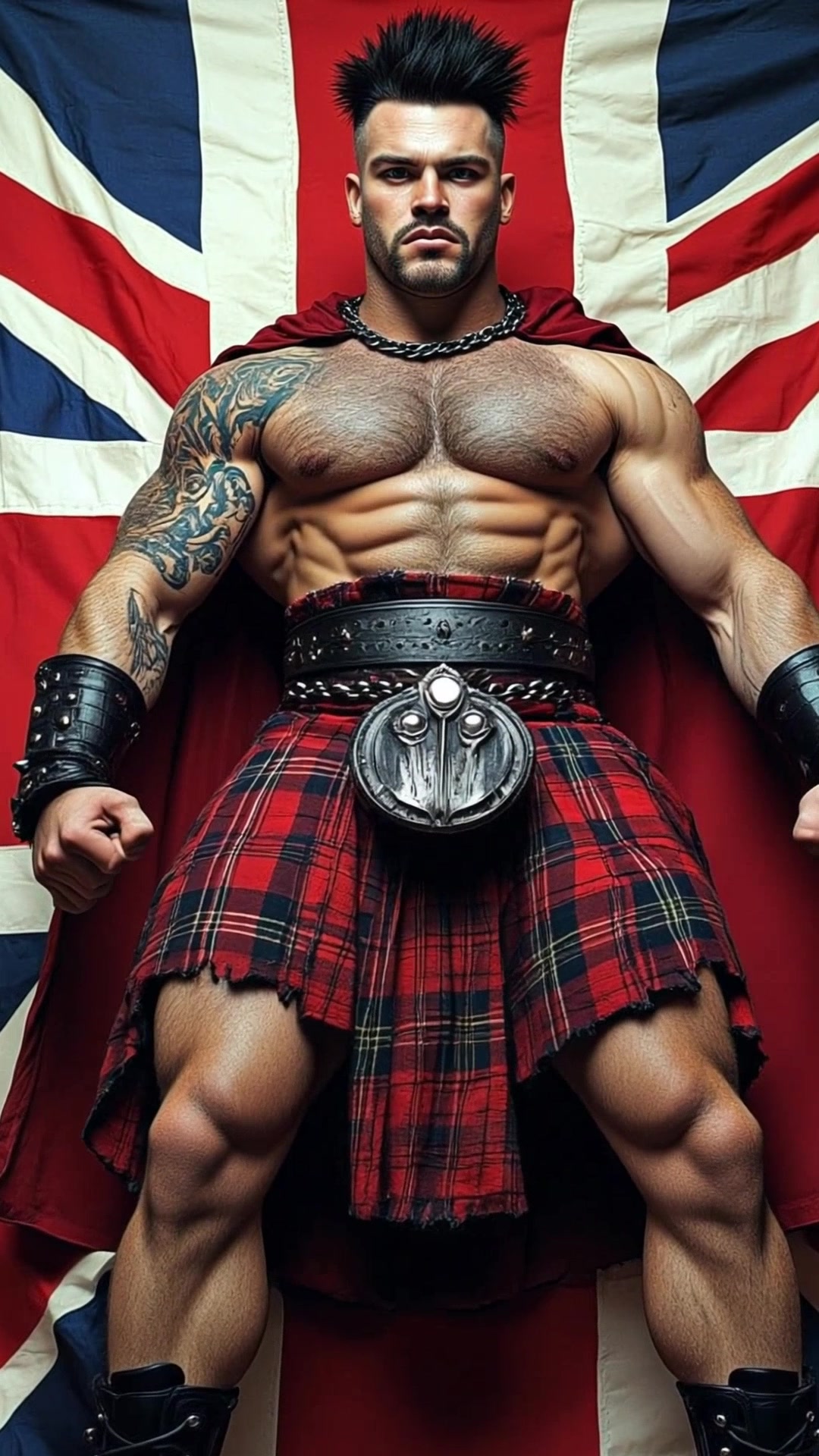 hypermasculine male super-hero. British Punk Rocker. Young man, college aged. Jet-black hair, shark fin Mohawk with shaved hair on the sides of head. Pale grey eyes, intense gaze, slight scowl on face. Handsome, strong brow and jaw. Soul Patch on face. Strong, muscular, sinewy, brute, broad chest and powerful legs. Extremely hairy hirsute body, especially on chest, torso, armpits and legs. Scorpion tattoo on chest. O-ring chain harness on chest. Black leather bracers/armbands with spikes. Dark red short cape, tattered and torn. Full kilt, red and black tartan pattern, no underwear underneath. Black leather studded belt. Kilt is worn and tattered, exposing hairy legs underneath. Black leather combat boots. Full body pose, fighting stance. British flag in background.
