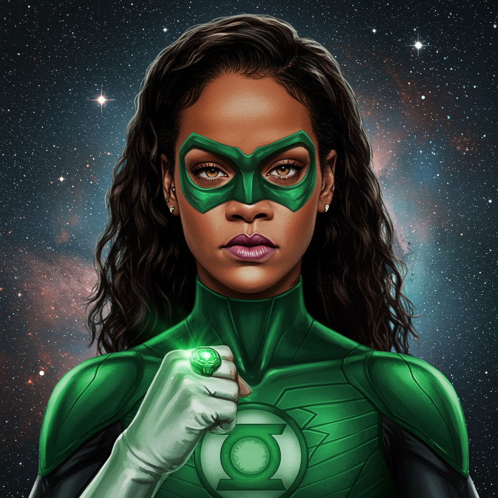 Hyperrealistic 8k portrait of a young Rihanna reimagined as a heroic Green Lantern, with luminous emerald energy emanating from her ring, intricate superhero costume gleaming with metallic accents, and a determined yet captivating expression on her face, set against a cosmic backdrop filled with distant stars and swirling galaxies.