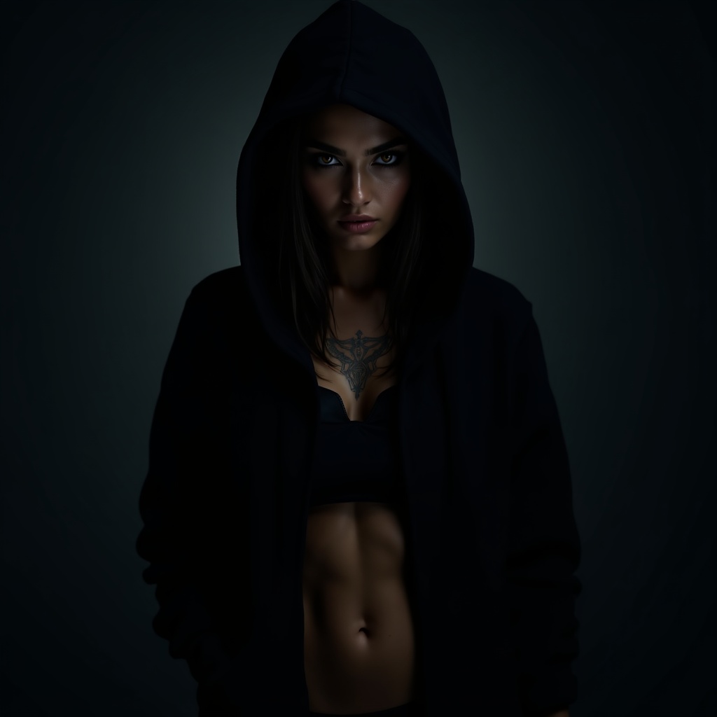 Hyperrealistic art, best quality, masterpiece, photography of a slender woman with defined abs, flat chest, captured during nighttime with a dark theme, illuminated by moonlight, wearing a black hoodie. She has piercing dark eyes and is set against a shadowy background. A detailed tattoo is visible, and she adopts a menacing pose. The dramatic lighting enhances her presence, pushing realism to the extreme with incredibly lifelike details. The image is characterized by its fine texture and high resolution. She looks directly at the viewer, creating an intense connection. The focus is solely on her with no additional elements to distract from her striking silhouette.