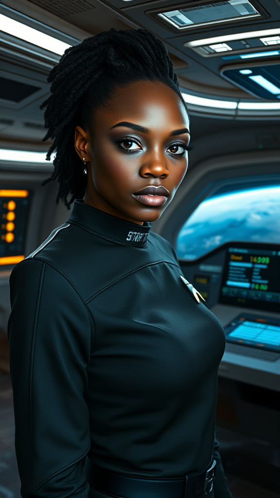 Hyperrealistic black female cadet from Starfleet on the detailed bridge of the Enterprise in outer space, illuminated by artificial lighting, in the style of Heather Buchanan. The scene captures the futuristic and intricate design elements of Star Trek, with a focus on authenticity, avoiding exaggerated features. The vastness of space is visible through the bridge's viewscreen, enhancing the sense of exploration and adventure, maintaining the core essence of the universe.