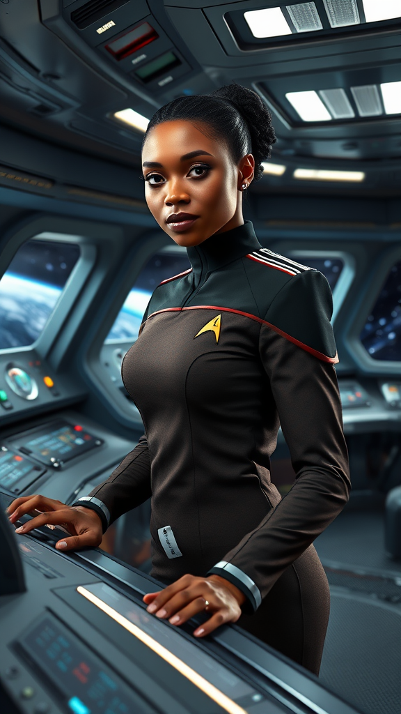 Hyperrealistic black female cadet in Starfleet uniform on the detailed bridge of the Enterprise from Star Trek, set in outer space with artificial lighting, inspired by the style of Heather Buchanan from ArtStation. The scene captures the advanced technology and elegance of the starship's interior, with vivid details and realistic textures. The cadet exudes confidence and curiosity as she interacts with the futuristic controls, surrounded by the vastness of space visible through the viewports. The composition maintains an accurate portrayal of human anatomy, avoiding any exaggerated features. The harmonious blend of Star Trek's iconic elements with a touch of creative flair results in a captivating visual narrative.