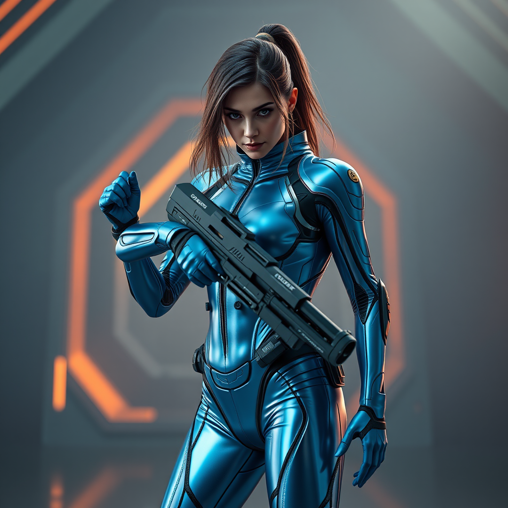 Hyperrealistic commercial photography of a full-body female figure in a sleek, metallic-blue sci-fi suit, wielding a futuristic weapon, studio lighting, 8k resolution, ultra-high detail, exquisite detailing, expert color grading, dramatic shadows, futuristic backdrop --ar 9:16 --v 4.