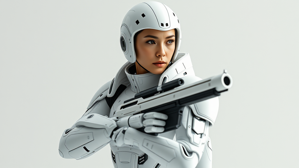 Hyperrealistic commercial photography of an armed female figure in an intricate white sci-fi suit, captured with studio lighting, showcasing 8k ultra high resolution. Features exquisite detailing and professional color grading, emphasizing the futuristic design. Set in a vertical aspect ratio to highlight her dynamic pose and the fine textures of her attire.