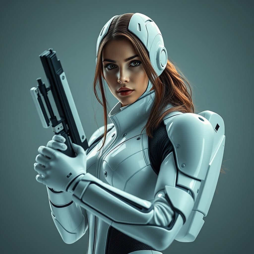 Hyperrealistic commercial photography of an armed female figure in a sleek, metallic white sci-fi suit, captured under expert studio lighting, ultra-high resolution 8k image, showcasing incredible detail and precision, enhanced with professional color grading, maintaining a futuristic and dynamic composition, aspect ratio 9:16, version 4, with subtle creative touches to highlight intensity and expression.