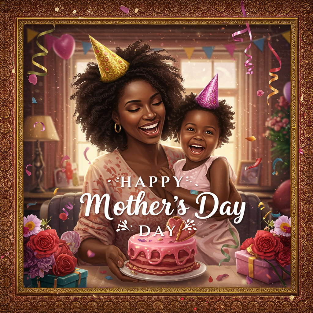 A stunning hyperrealistic depiction of an African American mother and her child joyfully celebrating Mother's Day, enveloped in a symphony of vibrant colors and intricate patterns. The scene is elegantly enclosed in a luxurious, ornate frame, perfectly capturing every element without cutting anything off. The artwork, rendered in a smooth airbrush style, radiates with an 8K acrylic finish, highlighting the mother's radiant smile and the festive ambiance. Prominently featured is the text 'Happy Mother's Day,' enhancing the joyful sentiment of the occasion. Playfully scattered flowers and streamers add an extra layer of festivity to the scene.