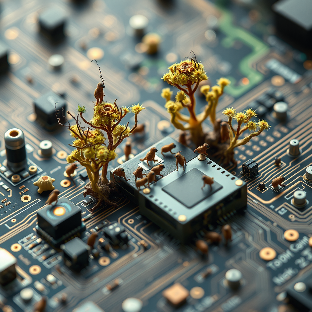 Hyperrealistic depiction of a microscopic community thriving on an intricate circuit board, showcasing detailed tiny inhabitants interacting with their electronic environment, the scene captured in stunning 8k resolution.