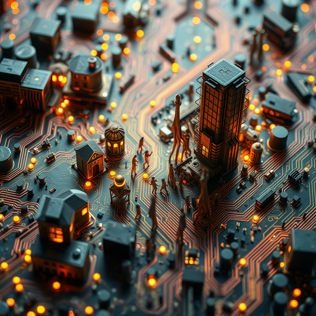 Hyperrealistic depiction of a microscopic society thriving amidst the intricate pathways and towering components of an 8k circuit board, where vibrant electronic micro-villages nestle within the labyrinthine landscape of silicon and copper, tiny beings navigating their electrified world with luminous networks glowing softly under a magnified lens.