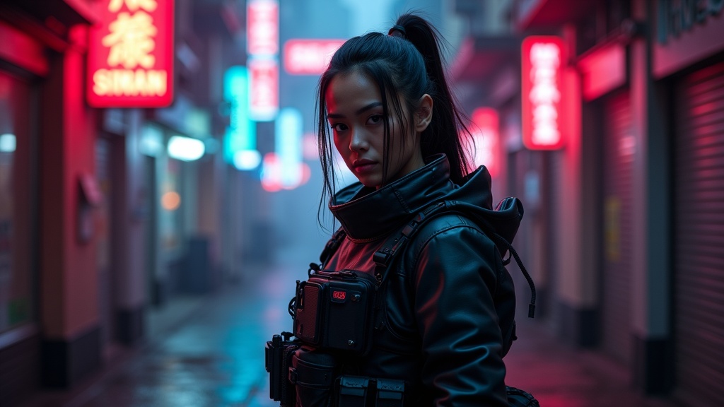 Hyperrealistic and intricately detailed full-length portrait of a woman in a combat uniform, set against the backdrop of a cyberpunk city, illuminated by vibrant neon lights in a dark alley. The composition is symmetrical and captured in sharp focus, showcasing smooth textures and adhering to the rule of thirds. The scene is insanely detailed with vivid colors, enhanced by advanced ray-tracing techniques for a photorealistic effect. Depth of field adds dimensionality, while professional color grading emphasizes the dynamic contrasts and futuristic ambiance, offering a mesmerizing visual experience in a hyper-modern metropolis.