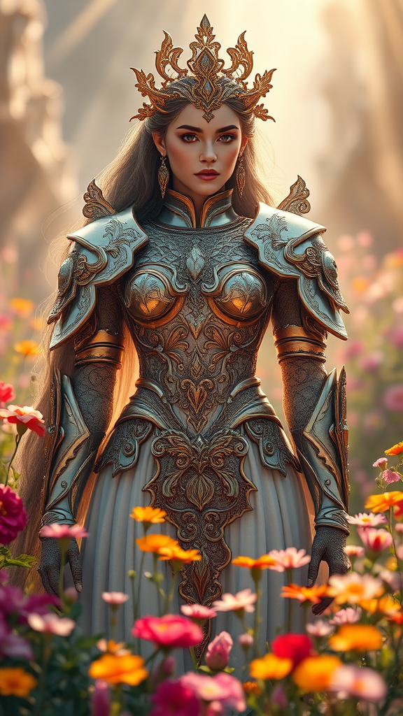 Hyperrealistic full-length portrait of an ethereal goddess standing amidst a vibrant meadow of flowers, featuring an exquisitely detailed and strikingly beautiful face. She is clad in elaborately crafted, shimmering armor that is both protective and alluring. Sunbeams cascade around her, creating a divine aura. The scene is intricate and majestic, with a cinematic depth of field that draws attention to her presence. This digital painting showcases refined character design and concept art, rendered with stunning realism and high detail in a captivating illustration.