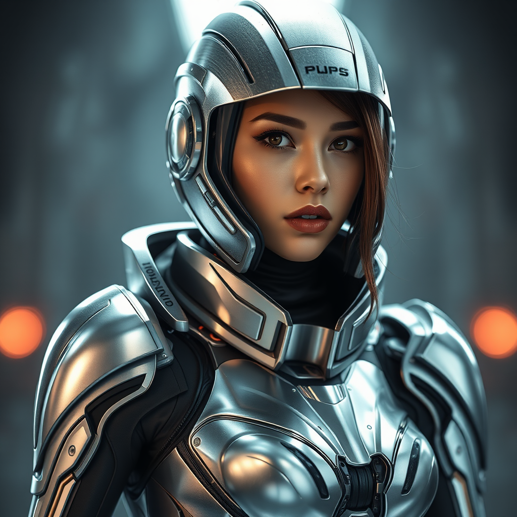Hyperrealistic image, commercial photography, armored female protagonist in a sleek silver sci-fi suit, precision studio lighting, ultra-high-definition, 8k resolution, extraordinarily detailed, intricate nuances, expert color grading, cinematic aspect ratio 9:16, version 4 aesthetics.