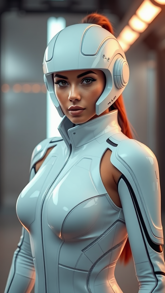 Hyperrealistic image, commercial-style photography, futuristic female figure in a sleek white sci-fi suit, sophisticated studio lighting, ultra-high-definition 8k resolution, incredibly detailed and precise fine details, expert color grading, portrait orientation, version 4.