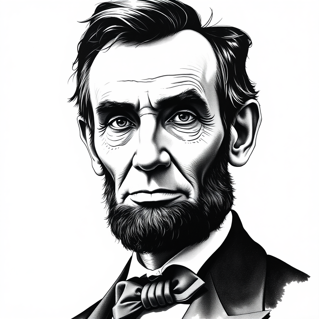 Hyperrealistic ink portrait of a distinguished historical figure reminiscent of Abraham Lincoln, rendered in intricate detail, with the image set against a pristine white background. Subtle modifications to the facial features add a unique twist while preserving the essence of the iconic leader.