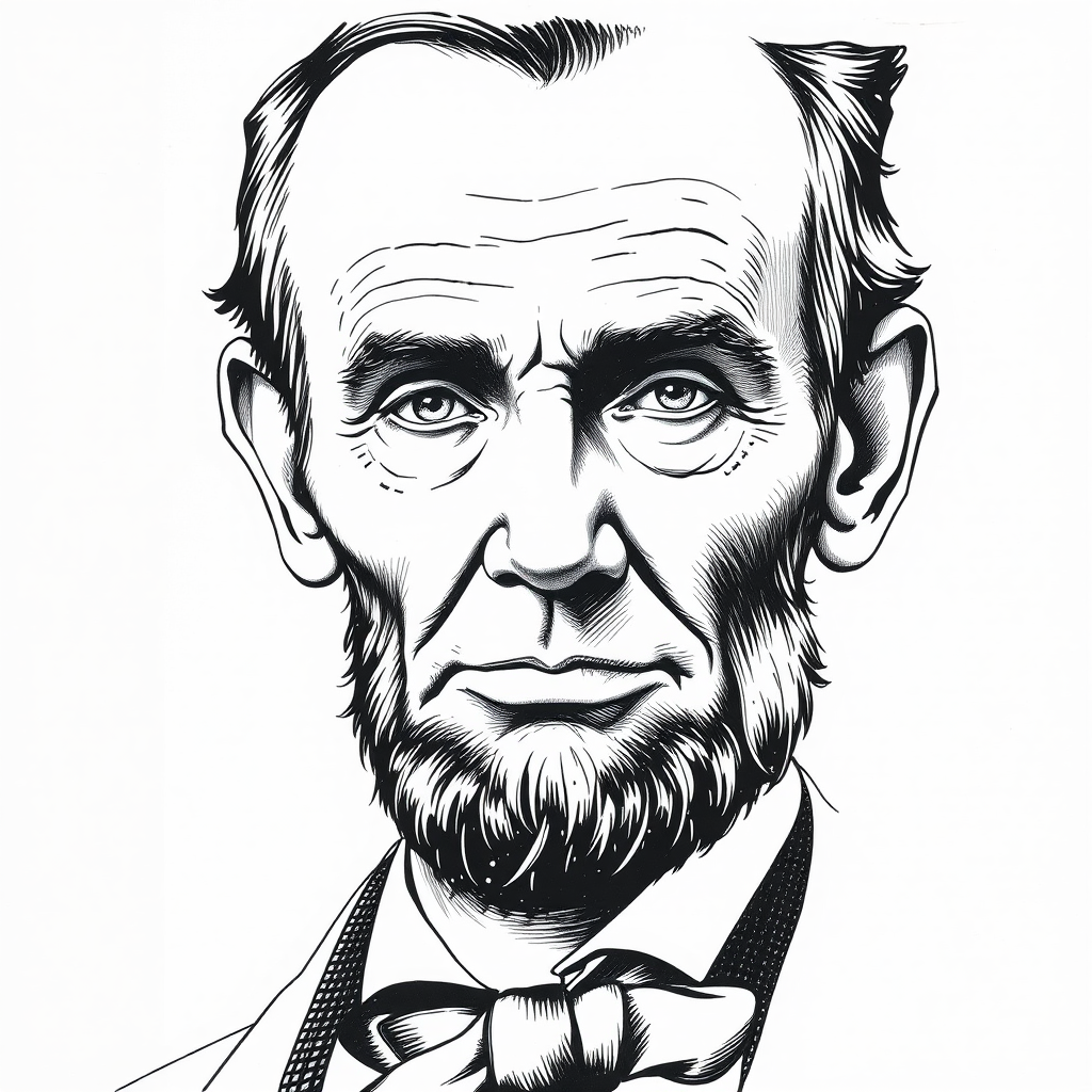 hyperrealistic ink portrait of abraham lincoln, detailed illustration, face isolated against a clean white background, subtle creative embellishments