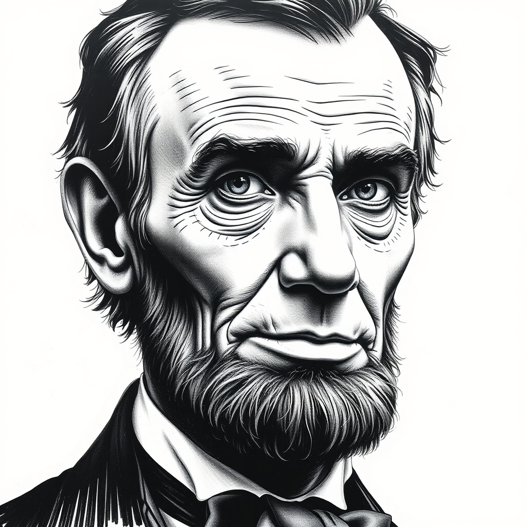 Hyperrealistic ink portrait of Abraham Lincoln, featuring intricate details and textures, against a clean white background, with subtle creative enhancements to the traditional depiction.