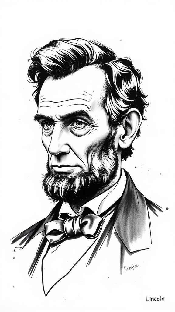 hyperrealistic ink portrait of Abraham Lincoln with slight artistic embellishments, set against a plain white backdrop