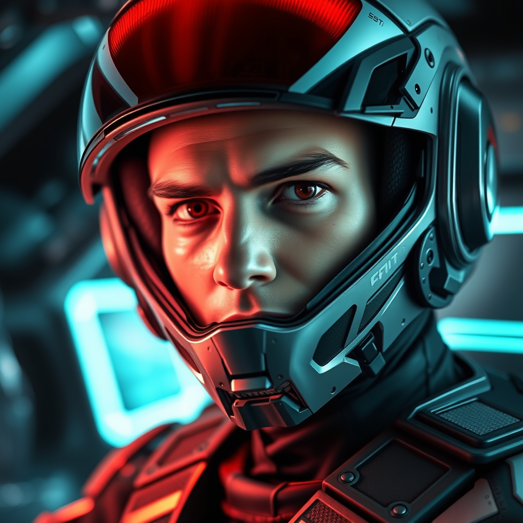 Hyperrealistic intricate detail portrait of a pilot in a futuristic cockpit, wearing a cutting-edge full-face helmet with a sleek design, his sci-fi armor glistening with hints of bioluminescence. The pilot is gazing directly into the camera with an intense focus. The scene is set in a cyberpunk universe, and the cockpit's interior is lined with glowing neon panels. The lighting is cinematic, casting dramatic shadows and highlighting the pilot's features, with a sharp focus and depth of field emphasizing the high-tech environment.