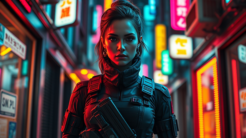 hyperrealistic intricate full-length portrait of a woman in a combat uniform standing in a neon-lit cyberpunk city alley, emphasizing symmetry with a sharp focus and smooth textures, adhering to the rule of thirds, featuring intense detail and vivid colors, utilizing raytracing for photorealism, showcasing depth of field and expert color grading in an RTX environment