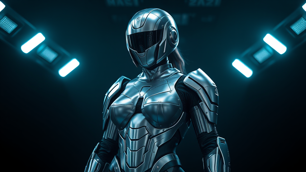 Hyperrealistic photo, commercial photography, full-body armored female figure in a sleek metallic silver sci-fi suit, dynamic studio lighting, 8k, ultra-high resolution, exceptionally detailed textures, intricate fine details, expert color grading, cinematic composition --ar 9:16 --v 4