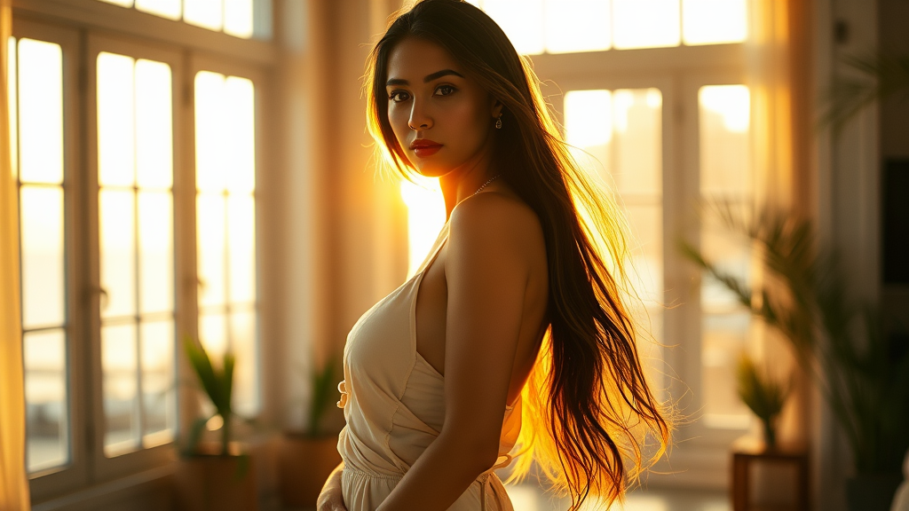 Hyperrealistic photo of a stunning young woman in elegant beachwear, shot on the latest iPhone 14 Pro Max, with long, flowing dark hair cascading over her shoulders. She stands in a bright and cozy room, bathed in the warm glow of golden hour sunlight streaming through large windows. The scene is captured with a film grain effect reminiscent of Kodak Portra 800, with a focus set to f1.8, adding a dreamy, vintage quality to the image while maintaining contemporary appeal.