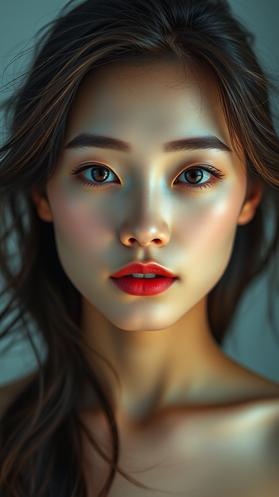 Hyperrealistic photo of an Asian beauty captured in a portrait style with a symmetrical composition, featuring soft and diffused lighting that highlights delicate skin texture. The image showcases natural yet vibrant colors with high saturation, drawing attention to her bright, expressive eyes and flowing hair. Inspired by the style of David LaChapelle, using a Canon EOS R5 mirrorless camera, the image conveys a dreamlike quality with an artistic twist, balancing surreal elements with authentic beauty.