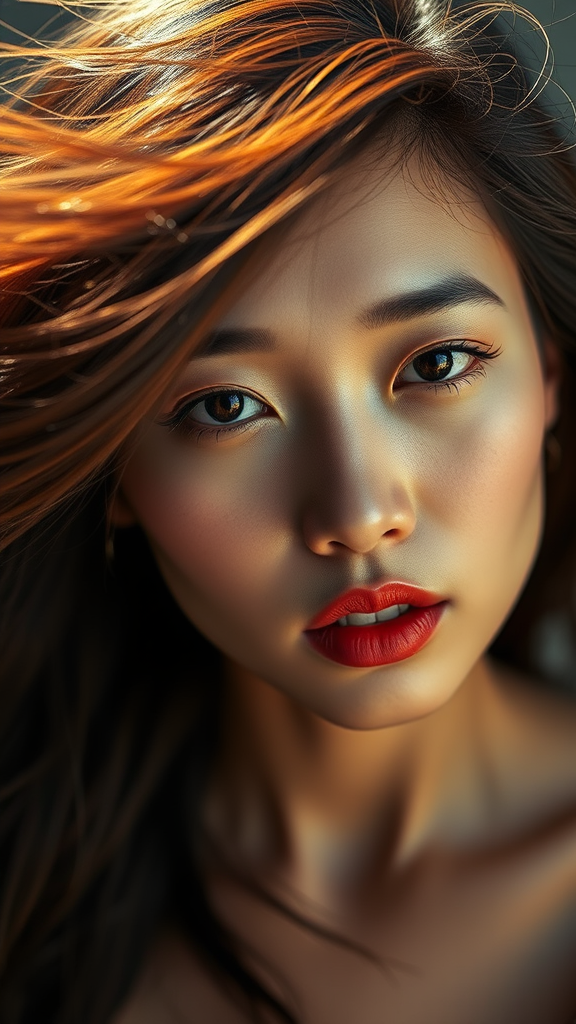 Hyperrealistic photo of an Asian beauty with portrait photography in a perfectly balanced composition, featuring gentle lighting and exquisite skin texture. Incorporating earthy, vibrant colors with heightened saturation, capturing luminous eyes and dynamic hair movement. Shot in the bold and imaginative style of photographer David LaChapelle, utilizing a Canon EOS R5 mirrorless lens, resulting in a 1:2 aspect ratio with a touch of surrealism and artistic flair.