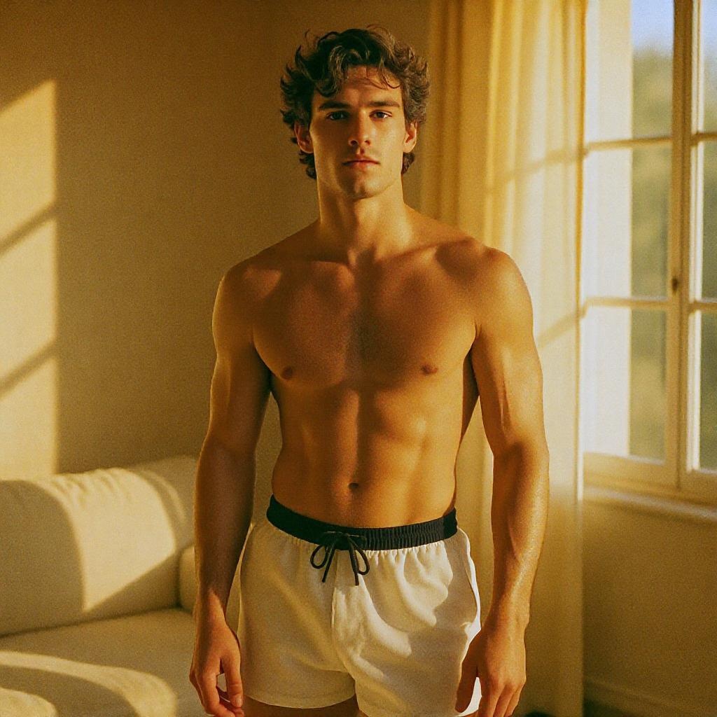 Hyperrealistic photo of an attractive male model in stylish beachwear, captured using an iPhone 14 Pro Max, tousled hair in a sunlit, inviting room :: Subtle film grain, Kodak Portra 800 aesthetic, f1.8 aperture, basking in the warmth of the golden hour.