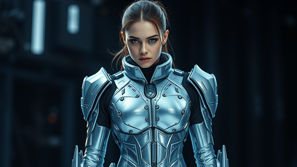Hyperrealistic photography, commercial shot, futuristic female warrior in a sleek silver sci-fi suit, precise studio lighting, ultra-high resolution 8k image, incredibly detailed with intricate elements, expert color grading, cinematic aspect ratio 9:16, version 4 with subtle creative enhancements.