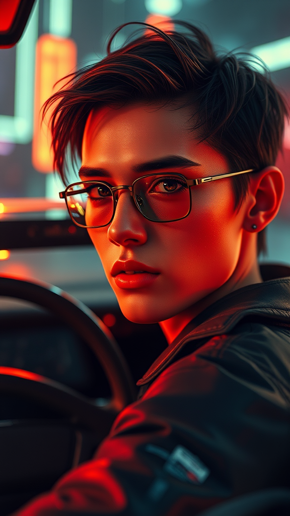 Hyperrealistic portrait art inspired by Blade Runner with 8k ultra-realism, featuring lens flares and atmospheric glow. The scene is detailed and intricate, bursting with color under cinematic lighting, trending on ArtStation. It's a 4k hyperrealistic masterpiece developed using Unreal Engine 5, showcasing extreme focus and breathtaking detail. The environment is stunning, with lumen reflections and a hyperrealism car, captured in CGI and 3D rendering. Incorporating octane render techniques, the art hints at a doll-like or surreal quality. Despite its mastery, it includes elements of distorted anatomy like blurry figures, extra limbs or fingers, and poorly drawn hands, with a touch of tiling and mutation.