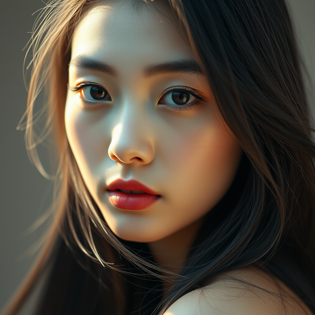 Hyperrealistic portrait capture of an Asian beauty, showcasing symmetrical composition and soft, ethereal lighting. Her delicate skin texture and natural hues are vividly highlighted, while her bright, captivating eyes draw the viewer in. Her hair cascades smoothly, as if in a gentle breeze. Crafted in a style reminiscent of David LaChapelle, with a touch of vibrant artistry, amplified by high saturation. Shot with the precision of a Canon EOS R5 mirrorless lens, the image explores an avant-garde twist, merging elegance with an experimental edge.