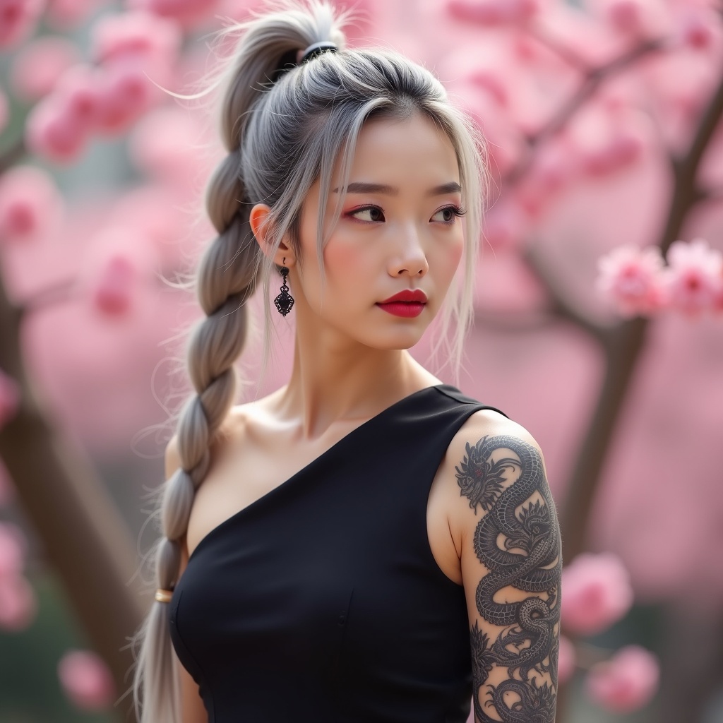View this AI-generated image featuring hyperrealistic portrait of an enchanting korean kpop idol with a silver braided ponytail intricate full sleeve dragon tattoo and striking red lips dressed in a form fitting all black sleeveless gown set against a mesmerizing cherry blossom backdrop captured wit