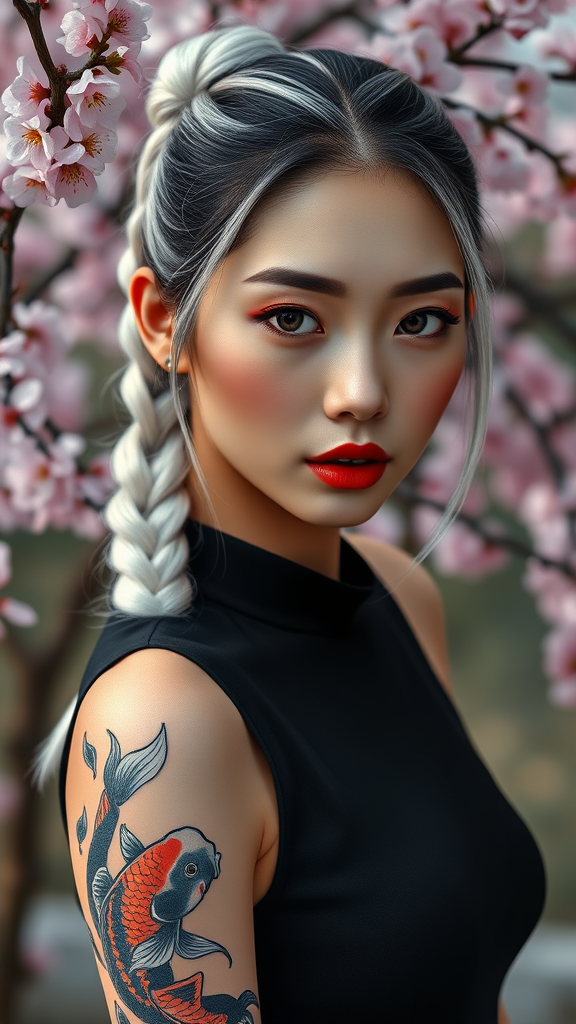 Hyperrealistic portrait of a beautiful Korean K-pop idol with a white braided ponytail, koi fish full sleeve tattoo, and vivid red lips, dressed in a sleek black sleeveless outfit, set against an enchanting cherry blossom background. Captured with a Canon R5 and a 200mm lens, the image is in sharp focus and shot in RAW format. The portrait highlights a meticulously detailed face in 8K HD quality, showcasing intricate skin texture and photorealistic features. Enhanced by cinematic lighting and vibrant colors, the image stands out as a masterpiece of digital art. The composition is professional and high-resolution, drawing inspiration from trends on Artstation with components like realistic skin texture and dramatic lighting effects, creating a lifelike, realistic portrayal.