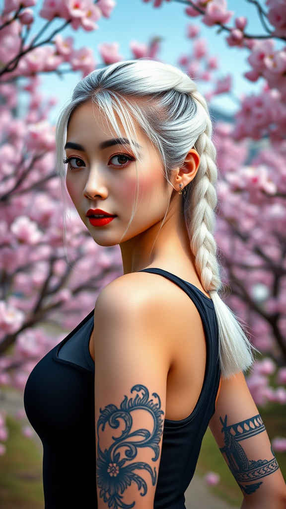 Hyperrealistic portrait of a captivating Korean K-pop idol featuring a chic white braided ponytail and elegant red lips. She displays a striking full-sleeve tattoo while donning a sleek, form-fitting all-black sleeveless bodysuit. The backdrop is a mesmerizing landscape filled with vibrant cherry blossoms. Captured with a Canon R5 200mm lens, the focus remains sharp, showcasing the subject's exquisite and intricate facial details in stunning 8k HD. The photograph exudes a professional, high-detail, and highly realistic quality with ultra-high resolution. Using physics-based rendering and cinematic lighting, the image presents a masterpiece of photorealism, emphasizing detailed skin texture and vivid colors. It's a hyper-detailed lifelike composition that draws inspiration from trending digital art on Artstation, echoing the realism and dramatic flair akin to the rich tonalities of Kodak Portra 400.