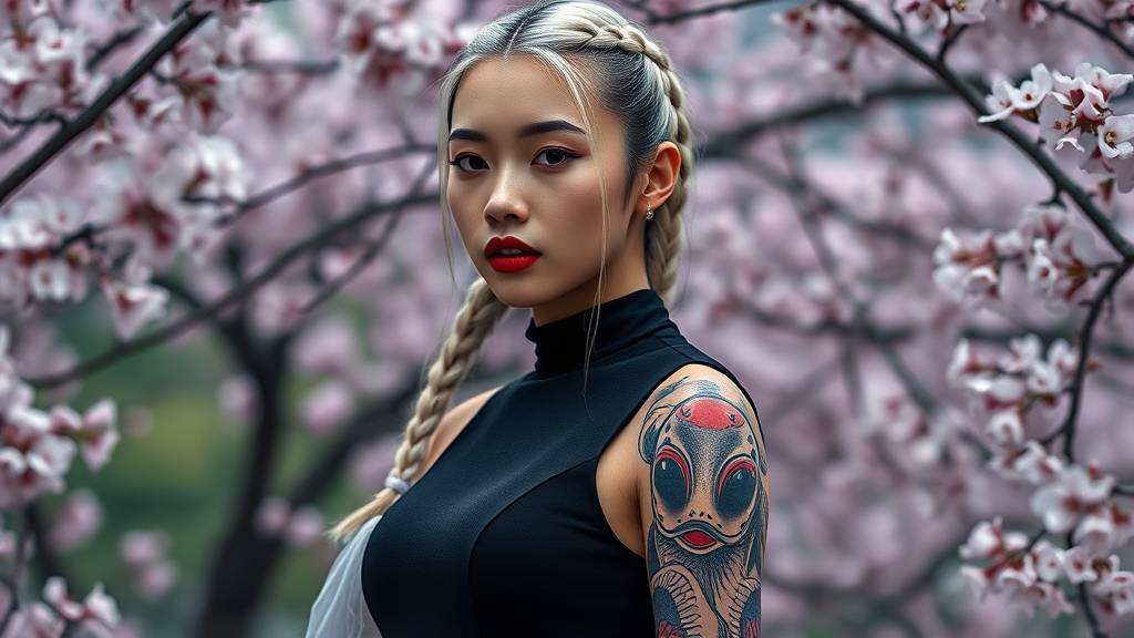 Hyperrealistic portrait of a captivating Korean K-pop idol with a sleek white braided ponytail and a stunning full sleeve koi fish tattoo. Her lips are painted a bold red, complementing a tight, form-fitting all-black sleeveless dress. She stands amidst a mesmerizing cherry blossom landscape. The image captured with a Canon R5 and 200mm lens in RAW format, focuses sharply on her intricately detailed face, showcasing 8k HD quality. The professional photo is captured in high detail with rich colors and dramatic, cinematic lighting. The tattoo and outfit are depicted with realistic texture, emphasizing the idol's elegance and artistic expression. The scene resembles a cinematic masterpiece with ultra-high resolution and lifelike elements rendered using advanced CGI techniques for a moody yet striking atmosphere.