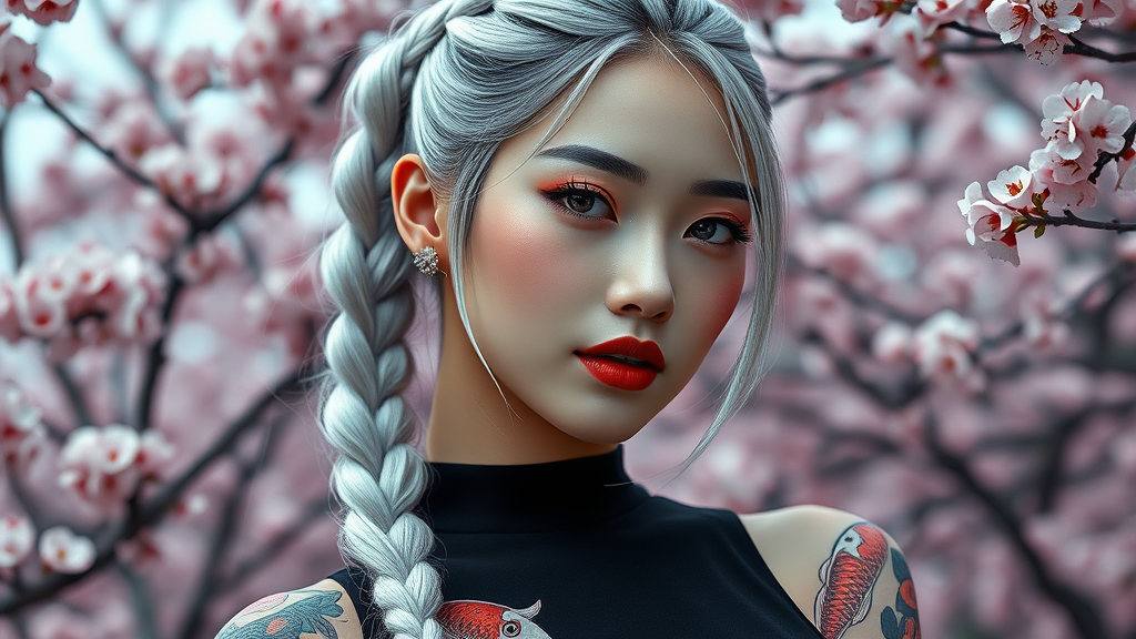 Hyperrealistic portrait of a captivating Korean kpop idol with a striking white braided ponytail and a mesmerizing full sleeve koi fish tattoo. Her vibrant red lips contrast against a sleek all-black sleeveless dress set in an enchanting cherry blossom landscape. Captured with a Canon R5 and a 200mm lens, the image boasts sharp focus and is shot in RAW, showcasing a highly intricate and photorealistic face in stunning 8k HD quality. The photograph, rich in detail and color, is a professional masterpiece with ultra high resolution. Utilizing physics-based rendering and cinematic lighting, this photorealistic digital art is trending on Artstation. It features highly detailed skin texture and embodies hyperrealism with lifelike qualities, dramatic lighting, and deep contrast. Influenced by Kodak Portra 400 film stock and captured with the essence of a Nikon D850 at f1.6, it emanates rich colors and a feel of cinematic allure. This exceptional work effortlessly blends elements from CGI, 3D rendering, digital painting, and illustration to create an awe-inspiring, realistic portrait perfect for 8k HD wallpapers.