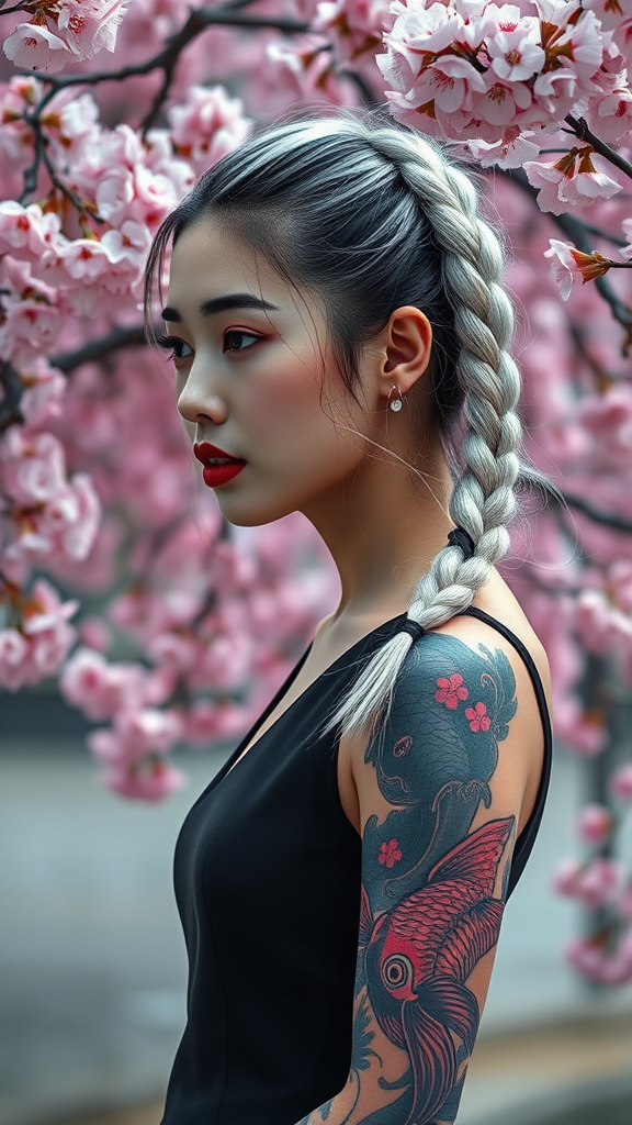 Hyperrealistic portrait of a captivating Korean kpop idol with a snow-white braided ponytail, intricate full sleeve koi fish tattoo, and striking red lips. She is adorned in a sleek all-black sleeveless dress set against a breathtaking cherry blossom background. Captured with a Canon R5 and 200mm lens, the image is in sharp focus and shot in RAW format. The portrait reveals an intricately detailed face in 8k HD quality, showcasing lifelike skin texture and vibrant colors. The photo is rendered with cinematic lighting, creating a high-contrast masterpiece of realism. Ultra high-res digital art, trending on Artstation, with a focus on photorealistic details, realistic skin, and color depth, resembling a portrait taken on Kodak Portra 400 film stock with a Nikon D850 and an f1.6 lens. Professional, crisp, and possessing dramatic lighting, the image emphasizes the subject's lifelike texture and elegant features within the tranquil floral scenery.