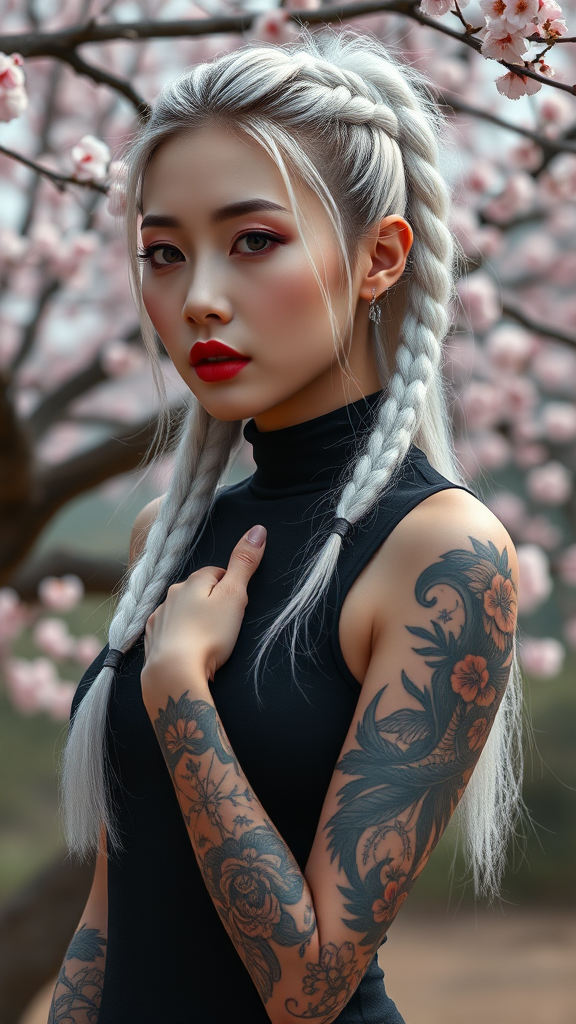 Hyperrealistic portrait of a mesmerizing Korean kpop idol with a striking white braided ponytail, showcasing intricate full sleeve tattoos and bold red lips. She is donned in a form-fitting all-black sleeveless bodysuit set against the enchanting background of a cherry blossom landscape. Captured with a Canon R5 using a 200mm lens, this image is in sharp focus and shot in RAW format, achieving an exquisite, highly detailed depiction in 8k HD quality. The portrait emphasizes a photorealistic, intricately detailed face, revealing fine skin textures under cinematic lighting. Created as a professional high-resolution RAW color photograph, it echoes the artistry found in trending digital art on Artstation, maintaining photorealism and vibrant, lifelike textures. The dramatic lighting and rich colors of this ultra-realistic rendering highlight a masterpiece quality, though slightly abstracted with creative modifications to infuse an air of fantasy.