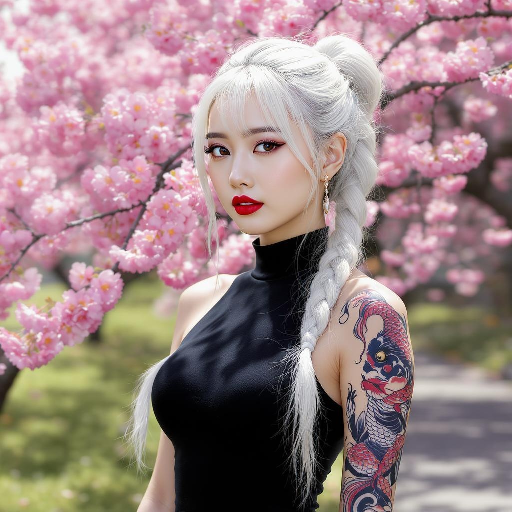 Hyperrealistic portrait of a mesmerizing Korean kpop idol featuring an intricate white braided ponytail and a striking full sleeve koi fish tattoo. Her bold red lips complement a sleek, form-fitting all-black sleeveless dress. She stands amidst a breathtaking cherry blossom landscape, captured with a Canon R5 using a 200mm lens. The photo boasts a sharp focus and is shot in RAW format, highlighting the intricate and photorealistic details of her face in stunning 8k HD quality. Bright sunlight filters through the blossoms, casting delicate shadows across her serene expression, adding a touch of ethereal beauty.