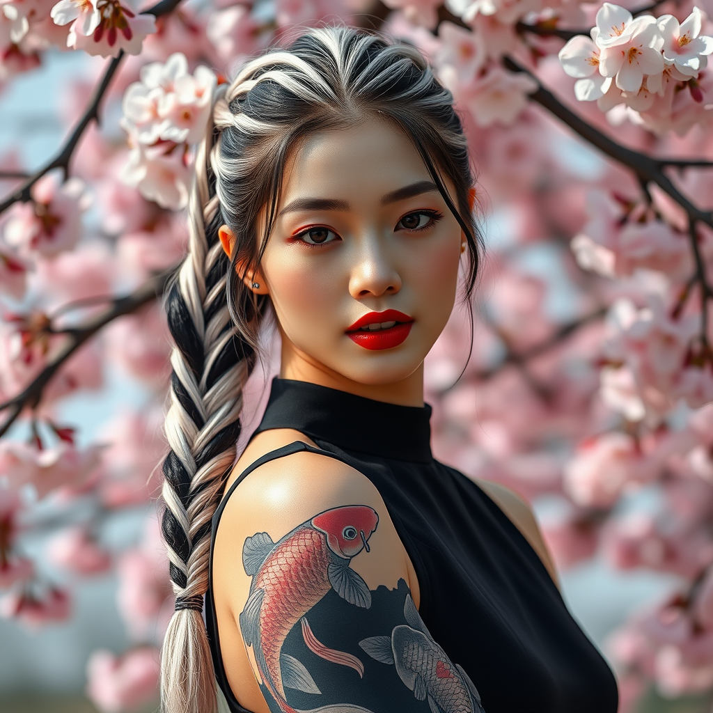Hyperrealistic portrait of a striking Korean K-pop idol with an intricate white braided ponytail and vibrant red lips, adorned with a full sleeve tattoo of mesmerizing koi fish, wearing a sleek all-black sleeveless dress set against a stunning cherry blossom backdrop. The image is captured with a Canon R5 and 200mm lens in sharp focus, and it is shot in RAW format, featuring an exquisitely detailed and lifelike face in 8k HD quality. This professional photo boasts ultra-high resolution with rich colors and dynamic, cinematic lighting, embodying the essence of photorealistic digital art trending on platforms like Artstation. Every skin texture and facial detail is presented with clarity and precision, utilizing physics-based rendering for a masterpiece of realism. The scene is reminiscent of a seamless blend of art and photography, akin to the quality expected from high-end film stocks like Kodak Portra 400, ensuring a vivid and immersive visual experience that captivates and inspires.