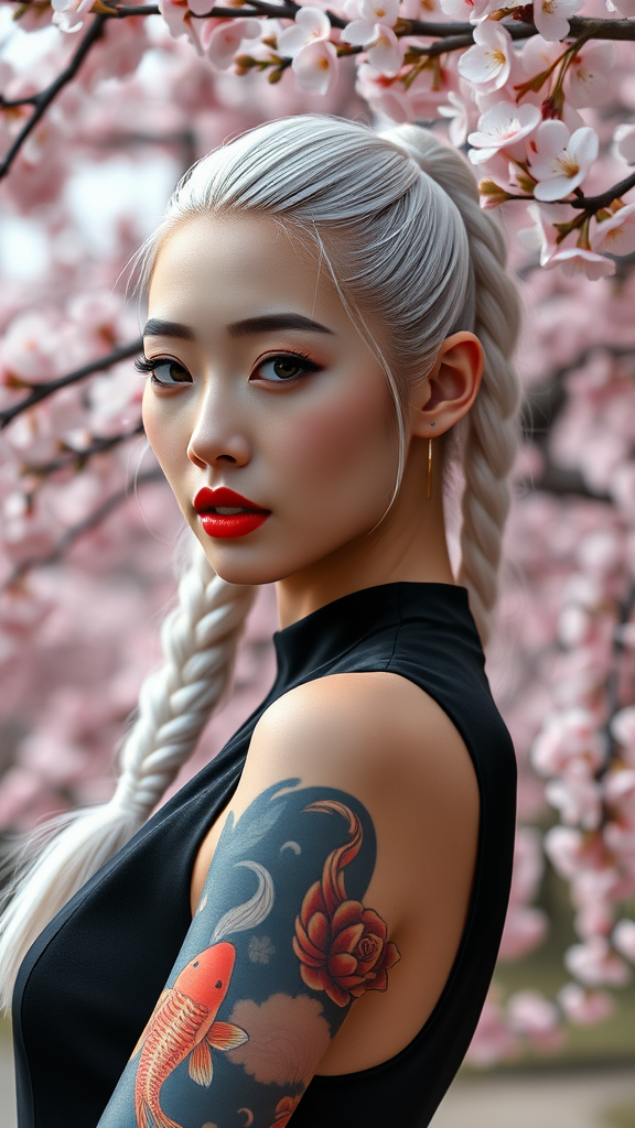 Hyperrealistic portrait of a striking Korean K-pop idol with a platinum white braided ponytail, adorned with a vibrant full sleeve tattoo of koi fish, and bold red lips. She is elegantly dressed in a sleek, form-fitting all-black sleeveless gown, set against the serene backdrop of a cherry blossom wonderland. Captured using a Canon R5 with a 200mm lens, the image features razor-sharp focus in RAW format. The portrait unveils an intricate, photorealistic visage in stunning 8k HD quality, embodying the essence of a high detail professional RAW color photograph. The composition highlights ultra-high resolution, with meticulously detailed skin texture and cinematic lighting, achieving a masterpiece of realism. The image draws on rich colors reminiscent of Kodak Portra 400 film, with dramatic lighting akin to an Unreal Engine production, while trending on Artstation. This photorealistic digital art is a testament to detailed craftsmanship, boasting lifelike textures and sharp, vibrant contrasts that captivate the viewer's eye.
