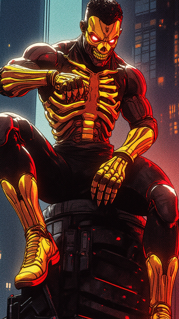 Hyperrealistic portrait of a vigilante anti-hero, cinematic composition, urban noir atmosphere. Athletic Caucasian male, muscular build, 5'10", wearing a tactical stealth suit in matte black nano-fabric. Ornate biomechanical yellow-gold skeleton design overlay across limbs, anatomically accurate bone patterns with metallic sheen. Combat boots rising to knees with aggressive V-cutout, deep crimson titanium toe caps. Armored gauntlets in metallic yellow-gold reaching elbows, featuring crimson finger-tips with retractable diamond-tipped claws. Custom electroshock weapon system generating vivid red lightning effects, 32k resolution electricity details. Chest armor features intimidating demon-face design: yellow-gold base with cut-out revealing matte black underlayer forming ribs, centered by menacing grin with sharp blood-red metal teeth. Upper chest includes glowing crimson LED eye shapes, shoulders sculpted into sharp horn-like points. Tactical neck guard in stealth black nanoweave, flowing into yellow-gold face mask with aggressive V-shape design. Mask features geometric black jaw section and prominent crimson V-shaped visor with internal illumination, creating threatening eyes effect. Modern undercut hairstyle with dark brown top length styled upward. Dynamic pose showing figure perched on gothic architecture, photographed from dramatic low angle. Moody nighttime urban setting with neon accent lighting, volumetric fog effects. Ray-traced reflections on metallic elements, cinematic color grading emphasizing deep shadows and selective highlights. Photorealistic materials and textures, 8k resolution, octane render, ultra-detailed, studio lighting with practical effects.