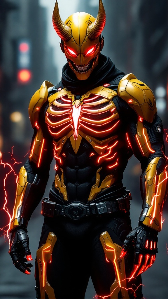 Hyperrealistic portrait of a vigilante anti-hero, cinematic composition, urban noir atmosphere. Athletic Caucasian male, muscular build, 5'10", wearing a tactical stealth suit in matte black nano-fabric. Ornate biomechanical yellow-gold skeleton design overlay across limbs, anatomically accurate bone patterns with metallic sheen. Combat boots rising to knees with aggressive V-cutout, deep crimson titanium toe caps. Armored gauntlets in metallic yellow-gold reaching elbows, featuring crimson finger-tips with retractable diamond-tipped claws. Custom electroshock weapon system generating vivid red lightning effects, 32k resolution electricity details. Chest armor features intimidating demon-face design: yellow-gold base with cut-out revealing matte black underlayer forming ribs, centered by menacing grin with sharp blood-red metal teeth. Upper chest includes glowing crimson LED eye shapes, shoulders sculpted into sharp horn-like points. Tactical neck guard in stealth black nanoweave, flowing into yellow-gold face mask with aggressive V-shape design. Mask features geometric black jaw section and prominent crimson V-shaped visor with internal illumination, creating threatening eyes effect. Modern undercut hairstyle with dark brown top length styled upward. Dynamic pose showing figure perched on gothic architecture, photographed from dramatic low angle. Moody nighttime urban setting with neon accent lighting, volumetric fog effects. Ray-traced reflections on metallic elements, cinematic color grading emphasizing deep shadows and selective highlights. Photorealistic materials and textures, 8k resolution, octane render, ultra-detailed, studio lighting with practical effects.