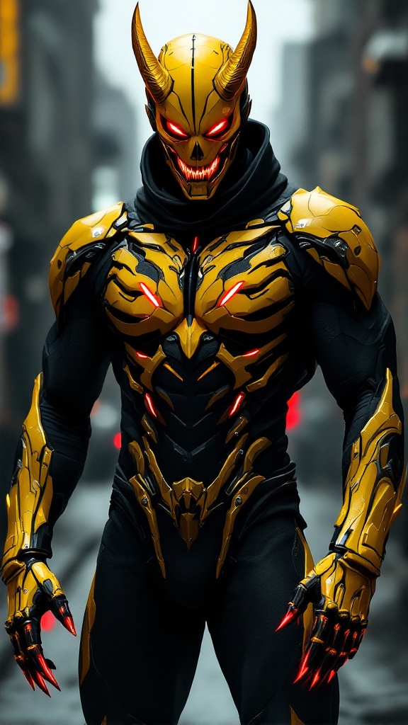 Hyperrealistic portrait of a vigilante anti-hero, cinematic composition, urban noir atmosphere. Athletic Caucasian male, muscular build, 5'10", wearing a spandex tactical stealth suit in matte black nano-fabric. Ornate biomechanical yellow-gold skeleton design overlay across limbs, anatomically accurate bone patterns. Yellow-gold combat boots rising to knees with aggressive V-cutout, deep crimson titanium toe caps. Armored gauntlets in metallic yellow-gold reaching elbows, featuring crimson finger-tips with retractable diamond-tipped claws. Custom electroshock weapon system generating vivid red lightning effects, 32k resolution electricity details. Chest armor features intimidating demon-face design: yellow-gold base with cut-out revealing matte black underlayer forming ribs, centered by menacing grin with sharp blood-red metal teeth. Upper chest includes glowing crimson LED eye shapes, shoulders sculpted into sharp horn-like points. Tactical neck guard in stealth black nanoweave, flowing into yellow-gold face mask with aggressive V-shape design. Mask features geometric black jaw section and prominent crimson V-shaped visor with internal illumination, creating threatening eyes effect. Modern fade hairstyle with dark brown top length styled upward. Dynamic pose showing figure perched on gothic architecture, photographed from dramatic low angle. Moody nighttime urban setting with neon accent lighting, volumetric fog effects. Ray-traced reflections on metallic elements, cinematic color grading emphasizing deep shadows and selective highlights. Photorealistic materials and textures, 8k resolution, octane render, ultra-detailed, studio lighting with practical effects.