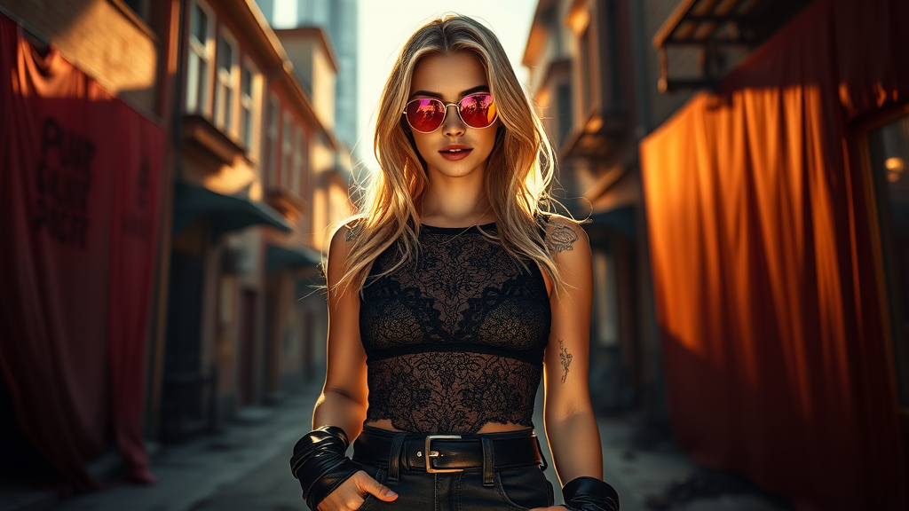 Hyperrealistic portrait of a young woman in a moody, Matrix-inspired environment, captured in vibrant, impressionistic lighting with rose-tinted sunglasses, black lace top, high-waisted jeans, and black leather boots, set against a backdrop of soft, natural light and cinematic shadows, with intricate, loose brushwork and lumen reflections rendered in stunning detail using Octane Render raytracing and deep-circular shadows, emphasizing the texture of her blonde hair and the reflective surfaces of her leather boots, as the warm sunshine casts a golden glow on her expressive features, amidst a CGI-generated environment of distorted buildings and gauzy veils, with subtle Hyperrealism enhancements to amplify the emotional depth and emotive resonance of the scene, all captured with a 85mm lens at a unique, almost-point-blank perspective that invites the viewer to step into the frame.