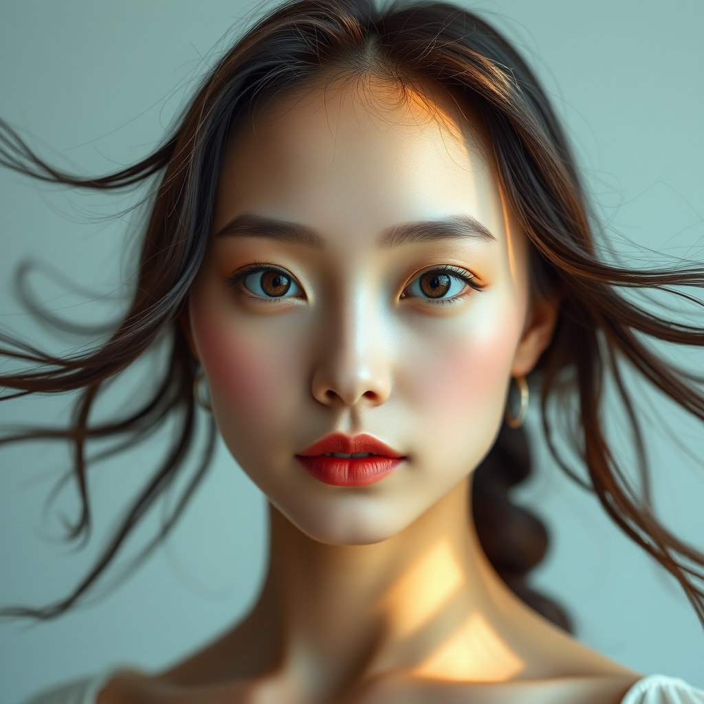 Hyperrealistic portrait of an Asian beauty with symmetrical composition, featuring soft and radiant lighting, a delicate and refined skin texture, and vibrant, natural colors. Her bright eyes and flowing hair are the focal points, captured in ultra-high saturation. The photography style is reminiscent of David LaChapelle, utilizing a Canon EOS R5 mirrorless camera for incredible detail. The scene combines elegance with a touch of surreal artistry, creating a captivating visual story with a hint of unexpected whimsy.