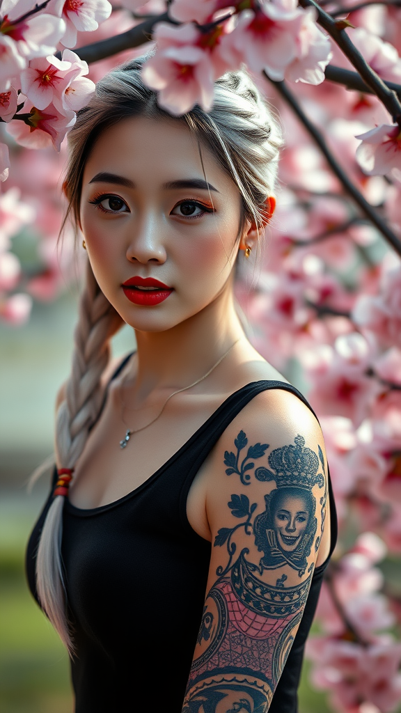 Hyperrealistic portrait of an enchanting Korean kpop idol featuring a white braided ponytail and a captivating full sleeve tattoo. Her striking red lips contrast beautifully with a sleek all-black sleeveless body suit. She is set amidst a mesmerizing cherry blossom landscape, captured with the Canon R5 and a 200mm lens for extreme sharpness in RAW format. The image highlights her intricately detailed face in 8k HD quality, utilizing cinematic lighting and photorealistic techniques for maximum realism. The vibrant colors and lifelike textures add depth, while the high contrast accentuates every nuanced detail. This high-resolution masterpiece is perfect for those seeking an ultra-detailed, hyper-real digital artwork experience, crafted with precision and rendered to perfection.